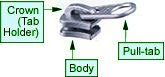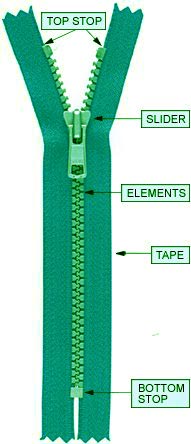 Zippers can be divided into three major parts: the tape, elements and slider.